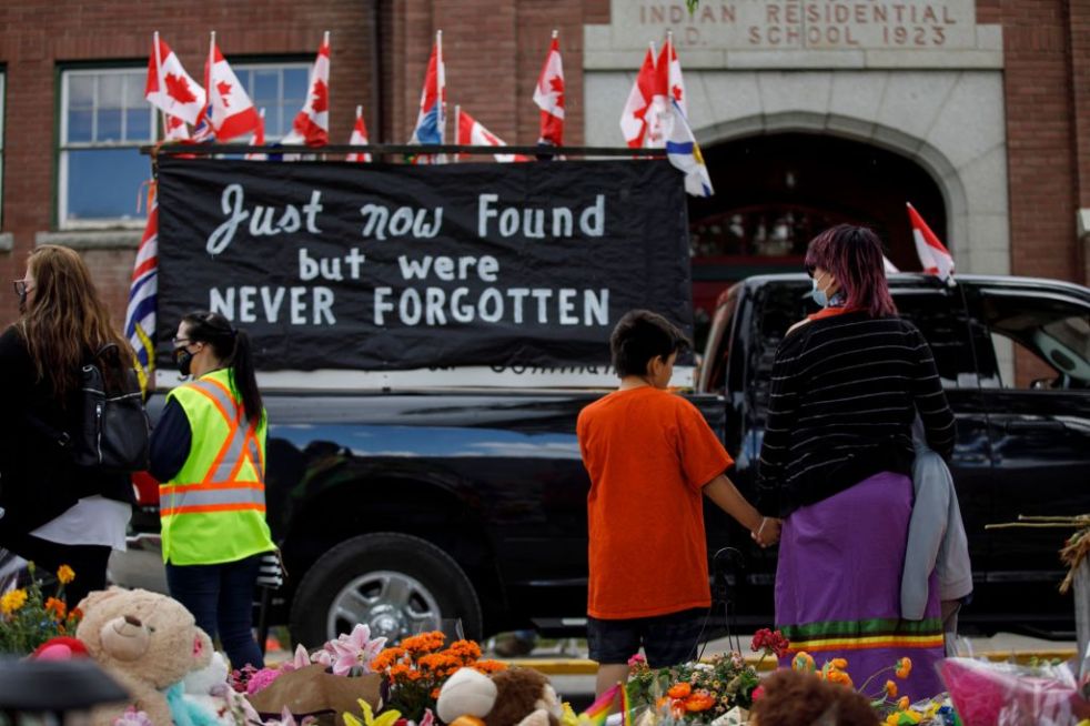 People watch as a convoy of truckers and other vehicles travel in front of the former Kamloops Indian Residential School in support of the Tk’emlups te Secwepemc people after the remains of 215 children were discovered buried near the facility, in Kamloops, Canada, on June 5, 2021. – Canadian Prime Minister Justin Trudeau on June 4 urged the Catholic Church to “take responsibility” and release records on indigenous residential schools under its direction, after the discovery of remains of 215 children in unmarked graves. (Photo by Cole Burston / AFP) (Photo by COLE BURSTON/AFP via Getty Images)